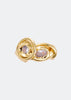 The Double sun ring by Voodoo Jewels is a gold-plated yellow bronze ring adorned with delicate white cubic zirconias, inspired by the autumn equinox. Each piece is uniquely handcrafted in Italy by Livia Lazzari, ensuring subtle variations from the pictured item.